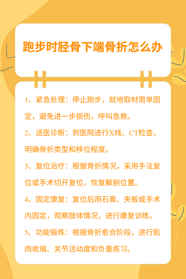 跑步时胫骨下端骨折可采取紧急处理、送医诊断、复位治疗、固定康复、功能锻炼等措施。