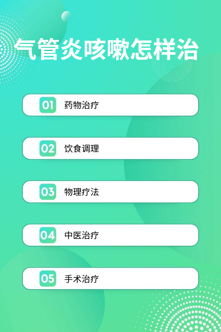 气管炎咳嗽的治疗方法有药物治疗、饮食调理、物理疗法、中医治疗、手术治疗等。