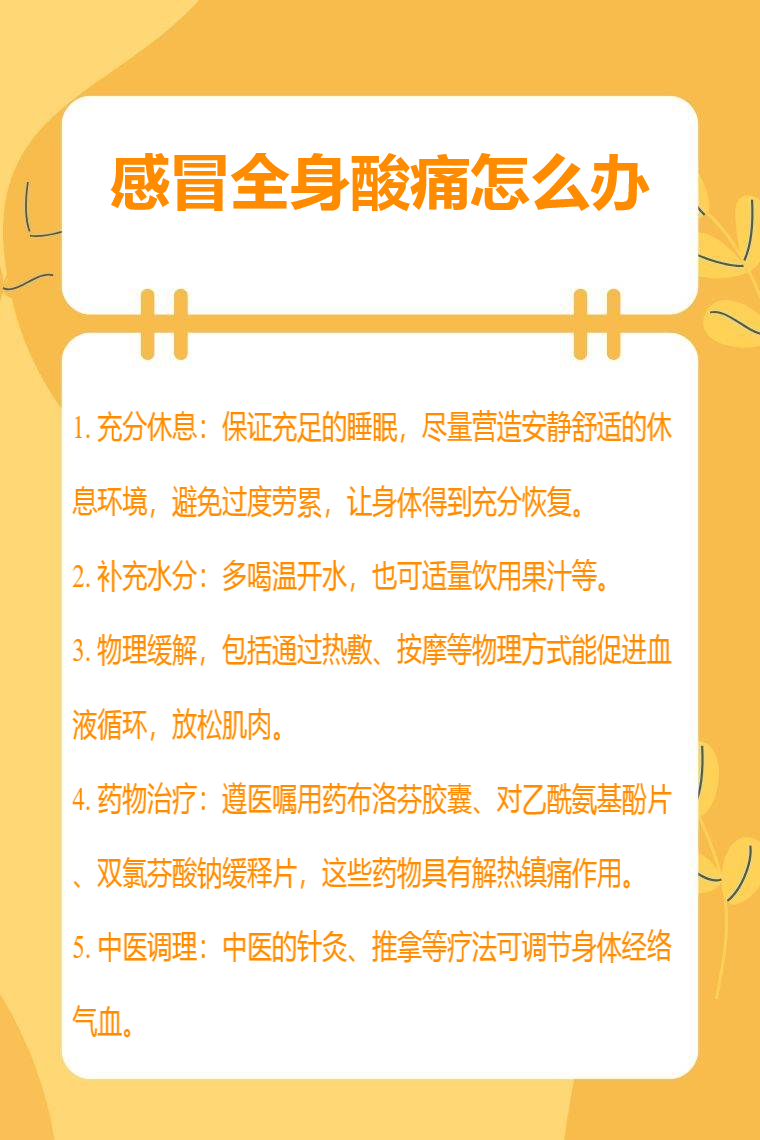 感冒全身酸痛可通过休息、补充水分、物理缓解、药物治疗、中医调理等方法来应对。