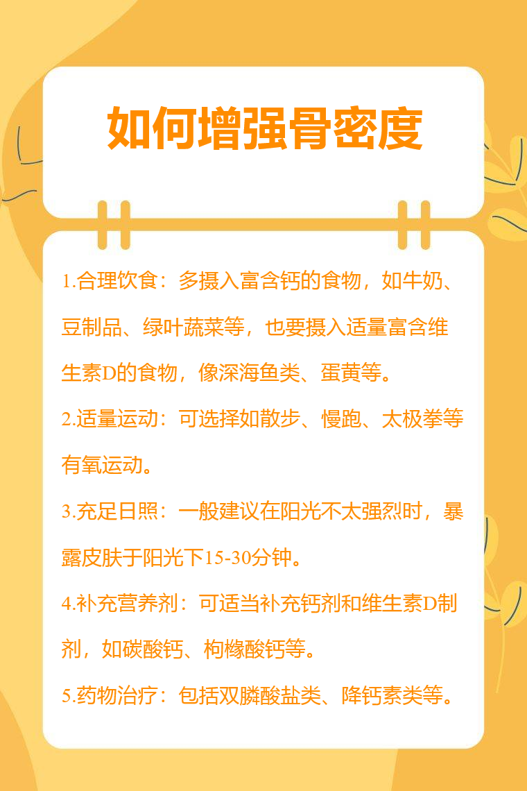 增强骨密度可通过合理饮食、适量运动、充足日照、补充营养剂、药物治疗等方式。