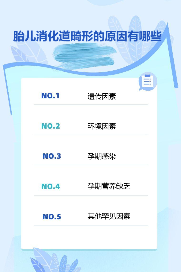 胎儿消化道畸形的原因有遗传因素、环境因素、孕期感染、孕期营养缺乏、其他罕见因素等。