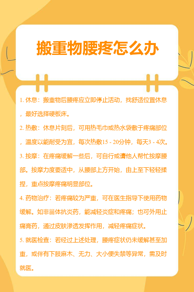 1. 休息:搬重物后腰疼应立即停止活动,找舒适位置休息,最好选择硬板床,能使腰部肌肉放松,减轻腰部压力,避免因继续活动加重损伤,为身体恢复创造良好条件。