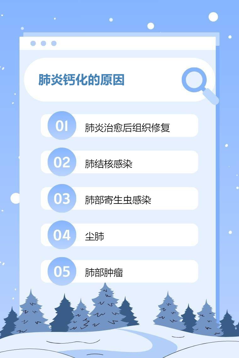 肺炎钙化的原因主要有肺炎治愈后组织修复、肺结核感染、肺部寄生虫感染、尘肺、肺部肿瘤等。