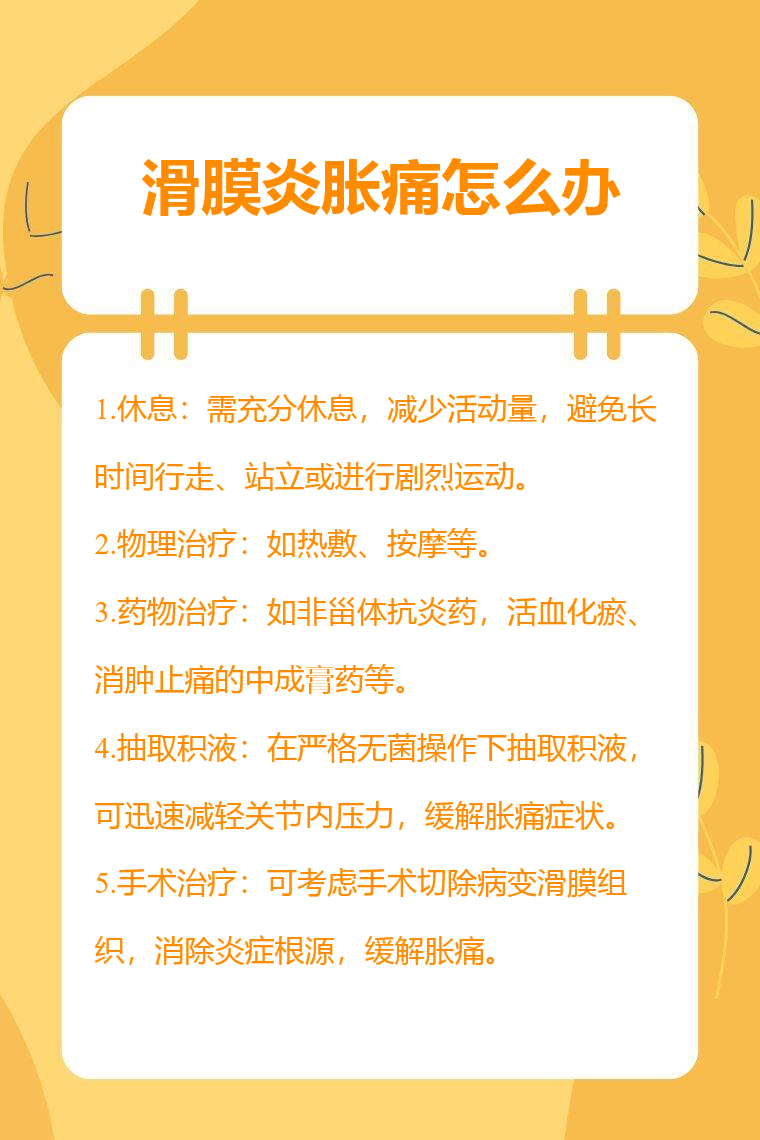 5.手术治疗:对于保守治疗无效、病情严重的情况,可考虑手术切除病变滑膜组织,消除炎症根源,缓解胀痛。