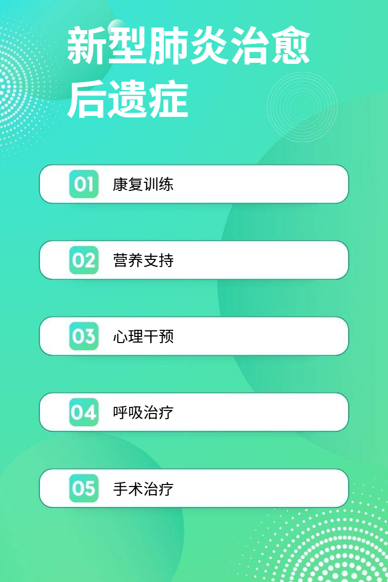 新型肺炎治愈后遗症可通过康复训练、营养支持、心理干预、呼吸治疗、必要时手术治疗等方法来应对。