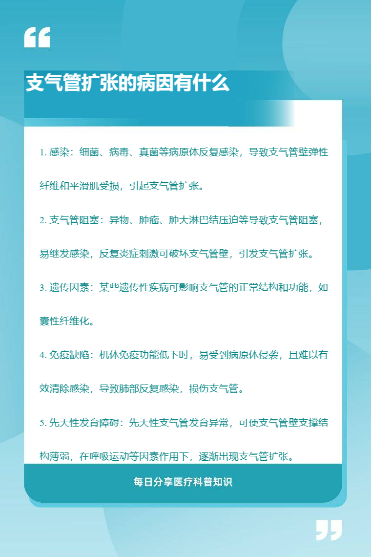 支气管扩张的病因有感染、支气管阻塞、遗传因素、免疫缺陷、先天性发育障碍等。