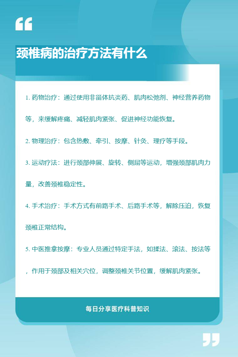 颈椎病的治疗方法有药物治疗、物理治疗、运动疗法、手术治疗、中医推拿按摩等。