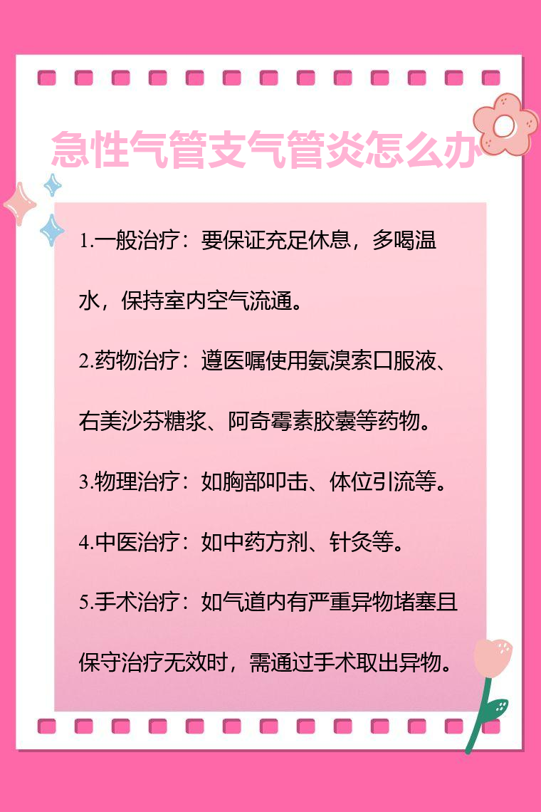 急性气管支气管炎可通过一般治疗、药物治疗、物理治疗、中医治疗、手术治疗等方法应对。