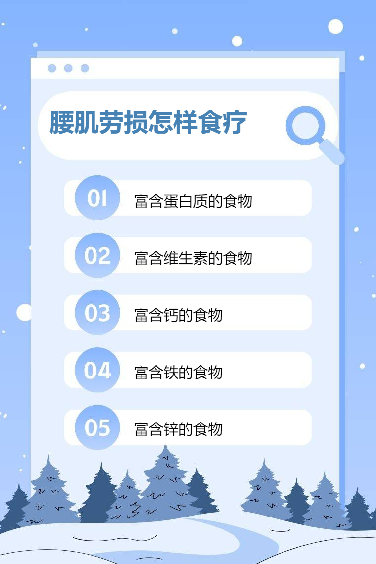 腰肌劳损可通过食用富含蛋白质的食物、富含维生素的食物、富含钙的食物、富含铁的食物、富含锌的食物等进行食疗。