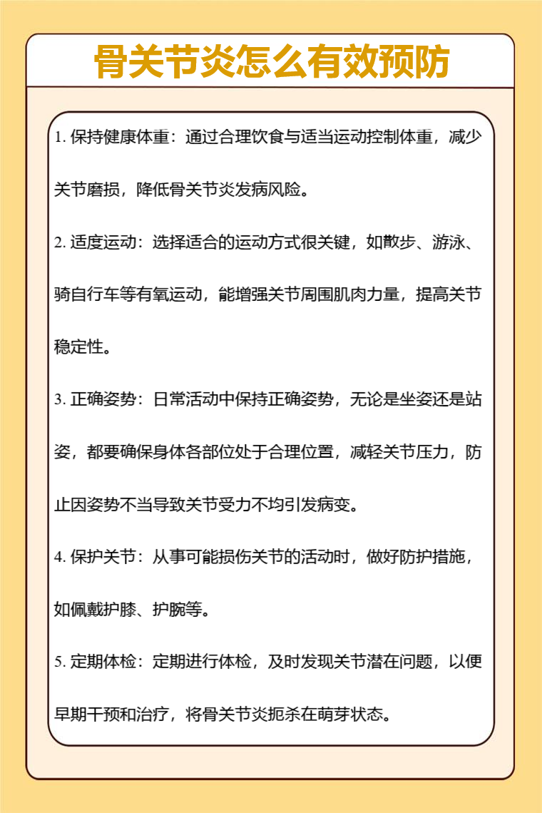 保持健康体重、适度运动、正确姿势、保护关节、定期体检等可有效预防骨关节炎。