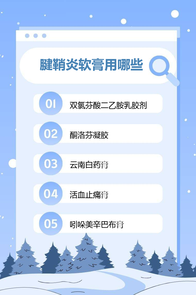 腱鞘炎软膏常见的有双氯芬酸二乙胺乳胶剂、酮洛芬凝胶、云南白药膏、活血止痛膏、吲哚美辛巴布膏等。