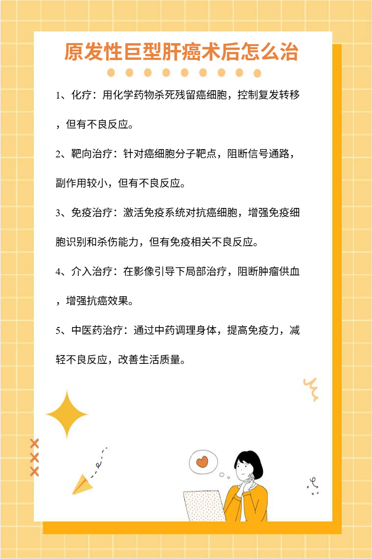 原发性巨型肝癌术后治疗方式有化疗、靶向治疗、免疫治疗、介入治疗、中医药治疗等。