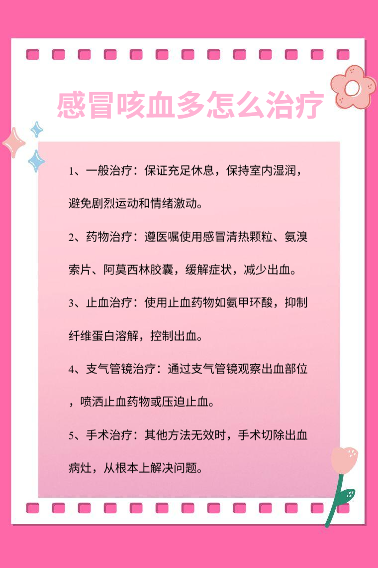 感冒咳血多可通过一般治疗、药物治疗、止血治疗、支气管镜治疗、手术治疗等方法应对。