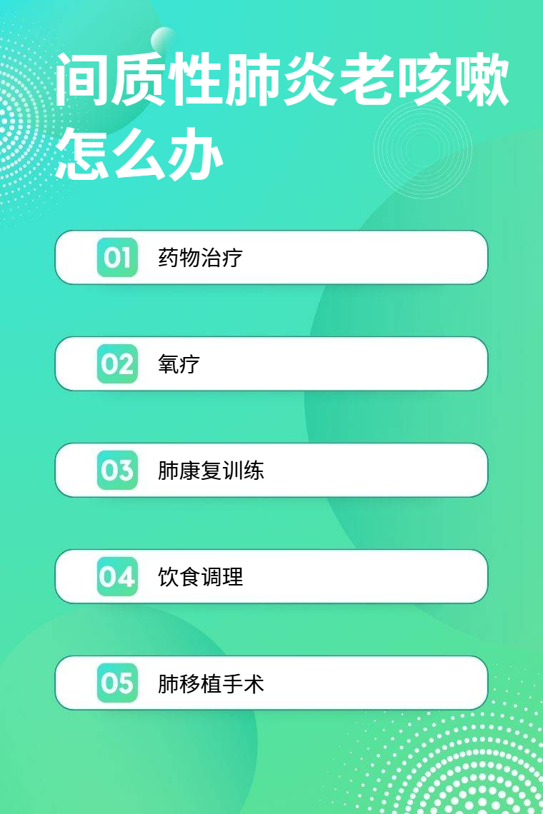 间质性肺炎老咳嗽可通过药物治疗、氧疗、肺康复训练、饮食调理、肺移植手术等方法来缓解症状、改善病情等。