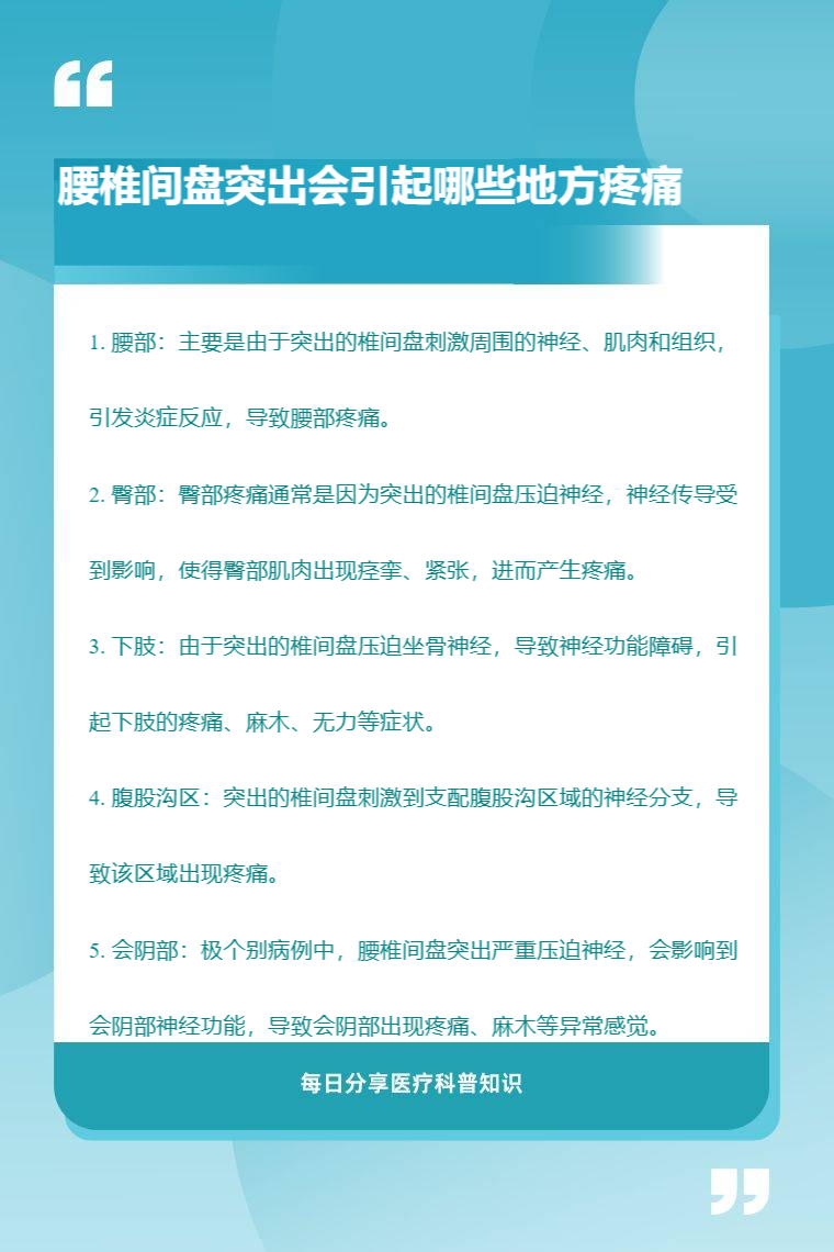 腰椎间盘突出会引起腰部、臀部、下肢、腹股沟区、会阴部等疼痛。