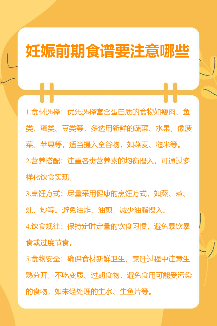 妊娠前期孕妇食谱要注意食材选择、营养搭配、烹饪方式、饮食规律、食物安全等。