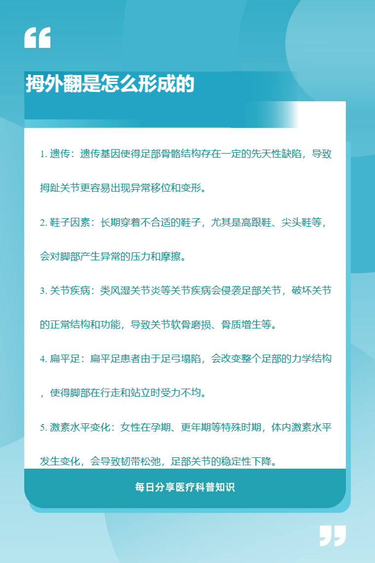 拇外翻的形成与遗传、鞋子因素、关节疾病、扁平足、激素水平变化等有关。