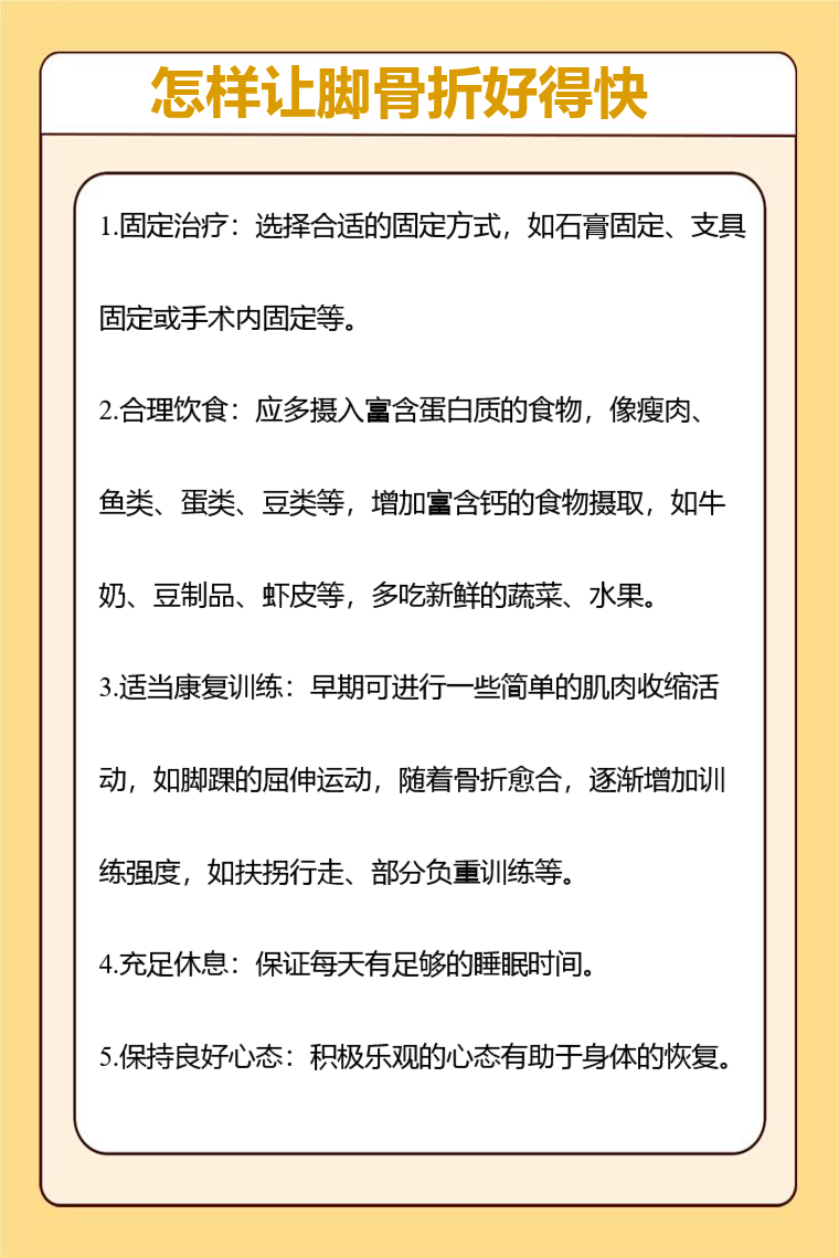 固定治疗、合理饮食、适当康复训练、充足休息、保持良好心态等可让脚骨折好得快。