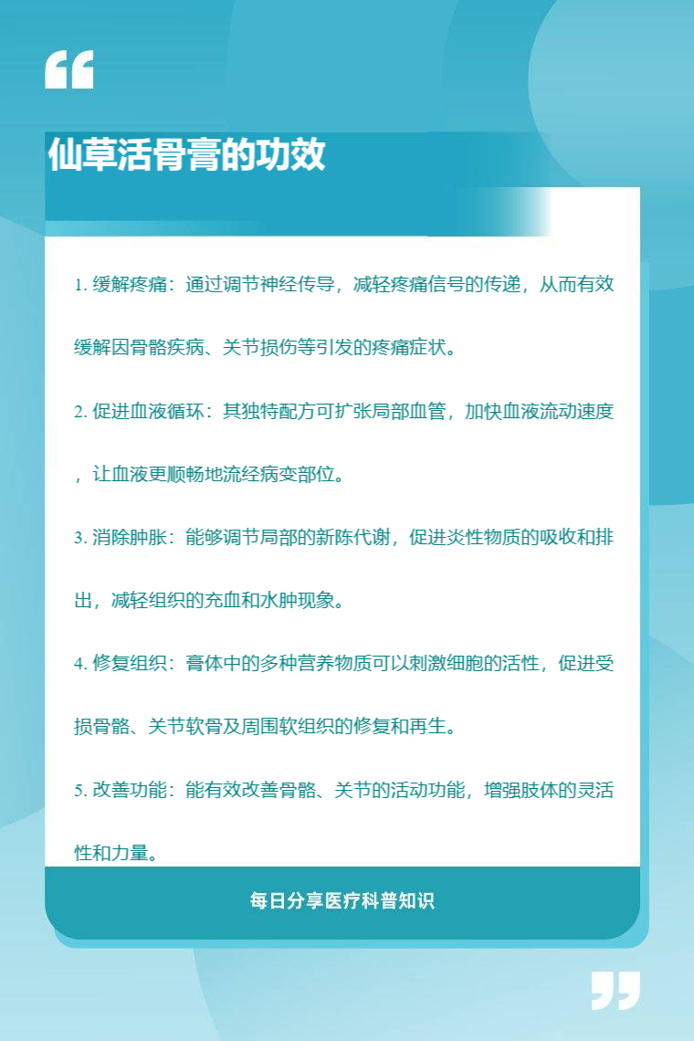 5. 改善功能:通过上述多种功效的协同作用,仙草活骨膏能有效改善骨骼、关节的活动功能,增强肢体的灵活性和力量,提高患者的生活质量。