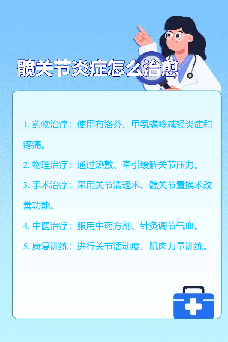髋关节炎症的治愈方式有药物治疗、物理治疗、手术治疗、中医治疗、康复训练等。