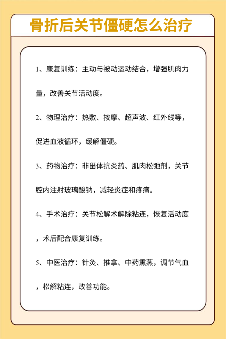 骨折后关节僵硬的治疗需综合多种方法,根据个人情况选择合适方案。治疗过程中要积极配合,保持耐心。日常注意关节保暖,避免过度劳累和损伤,定期复查,遵循医生建议调整治疗方案,以促进关节功能更好恢复。