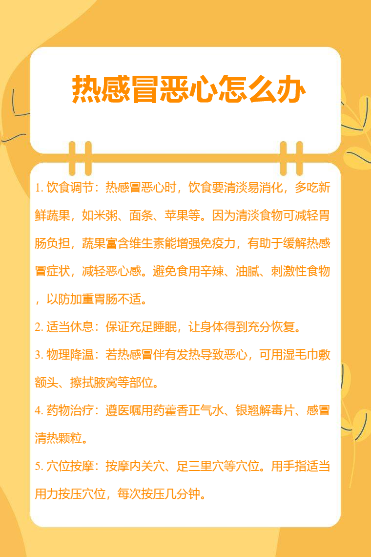 5. 穴位按摩:按摩内关穴、足三里穴等穴位。内关穴位于手腕横纹上两寸,按摩此穴位可调节胃肠功能,缓解恶心;足三里穴在小腿外侧,犊鼻下三寸,按摩它能促进胃肠蠕动,增强消化功能,减轻热感冒带来的恶心不适。用手指适当用力按压穴位,每次按压几分钟。