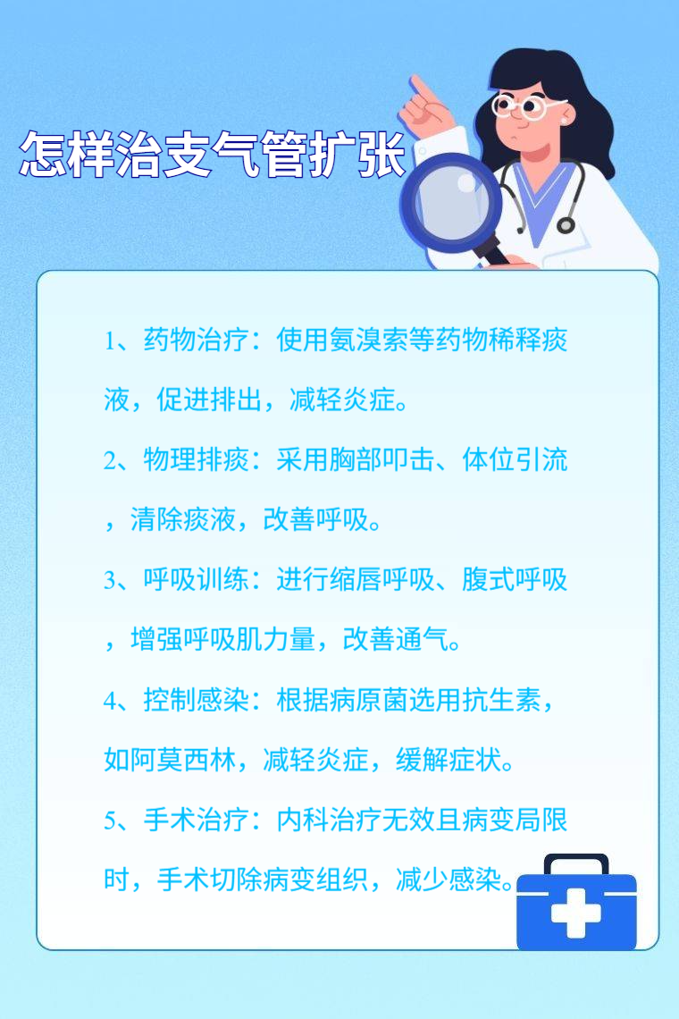 支气管扩张的治疗方法主要有药物治疗、物理排痰、呼吸训练、控制感染、手术治疗等。