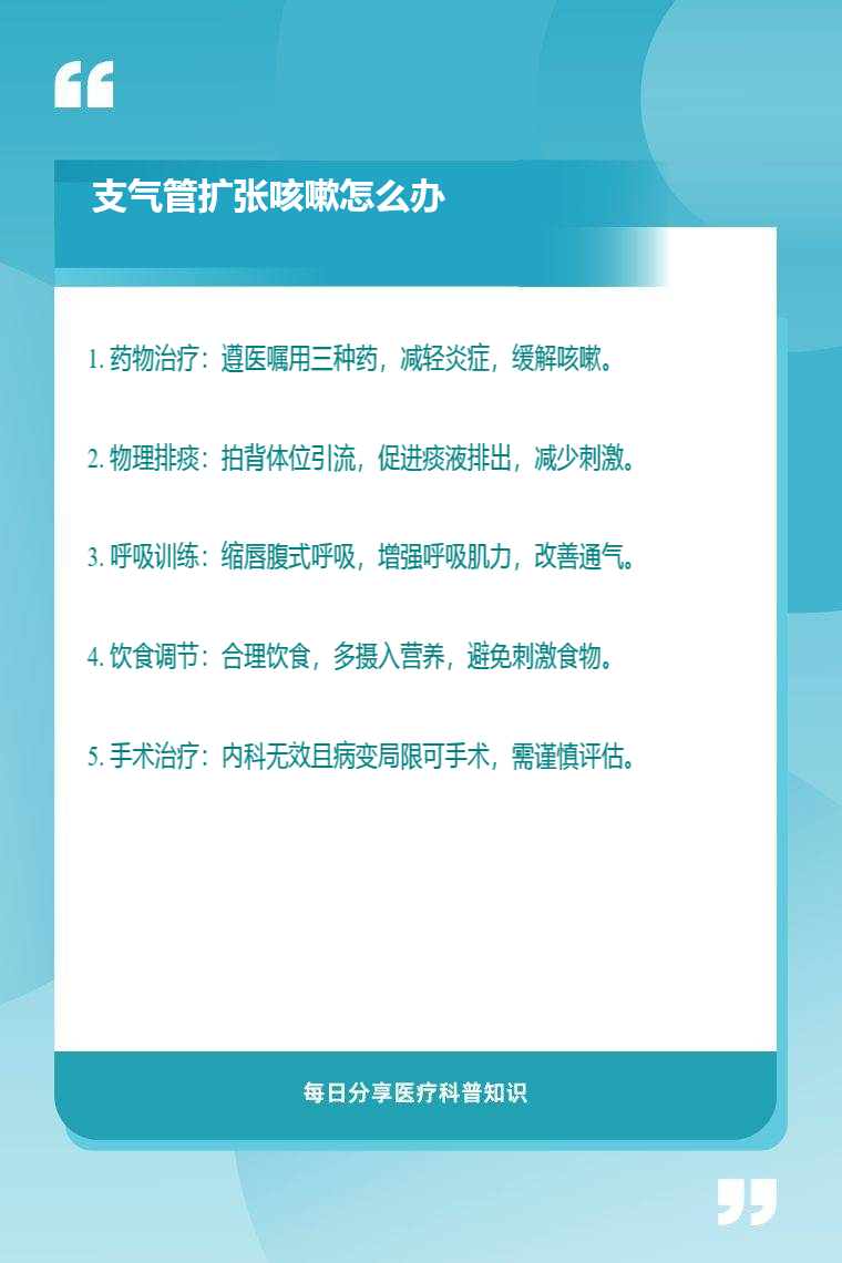5. 手术治疗:对于经内科治疗无效,且病变局限的支气管扩张患者,可考虑手术治疗。手术切除病变肺组织,去除病灶,从根本上解决因病变导致的咳嗽问题。但手术有一定风险,需综合评估患者身体状况、病变范围等因素后谨慎选择。