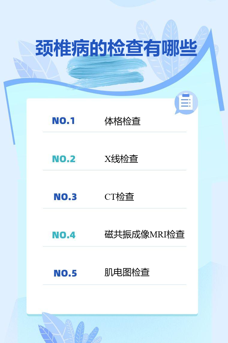 颈椎病的检查有体格检查、X线检查、CT检查、磁共振成像MRI检查、肌电图检查等。