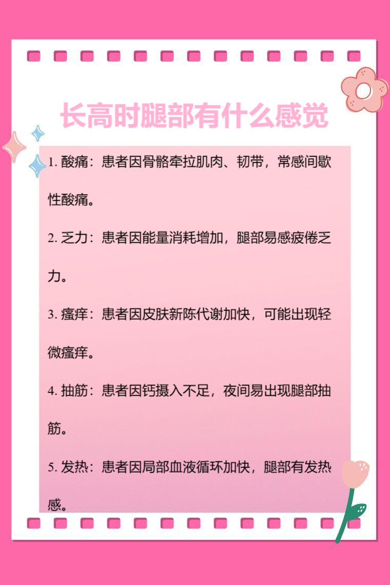 长高期间要注意保持均衡的饮食,多摄入富含蛋白质、钙等营养物质的食物,如牛奶、鸡蛋等,同时保证充足的睡眠和适当的运动,这些都有助于身体的正常发育。若腿部出现异常不适且持续不缓解,应及时就医检查。