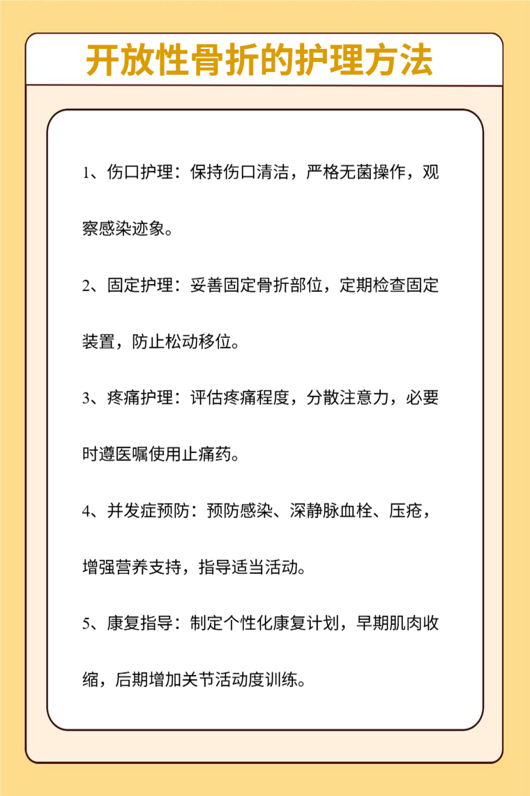 开放性骨折的护理方法包括伤口护理、固定护理、疼痛护理、并发症预防、康复指导等。