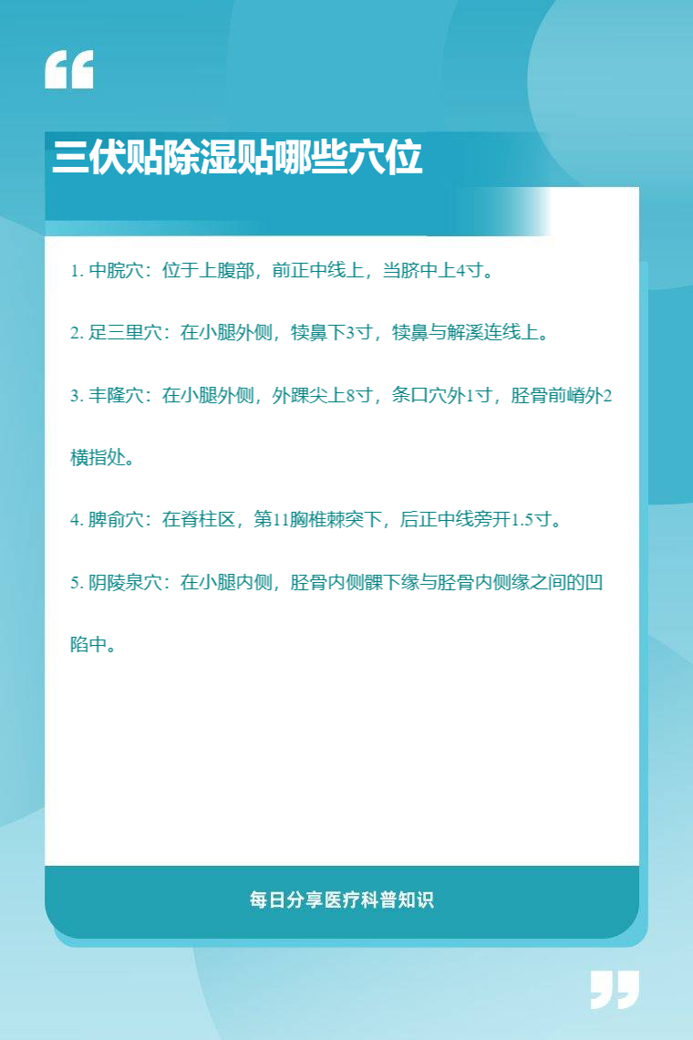 三伏贴除湿可贴的穴位有中脘穴、足三里穴、丰隆穴、脾俞穴、阴陵泉穴等。