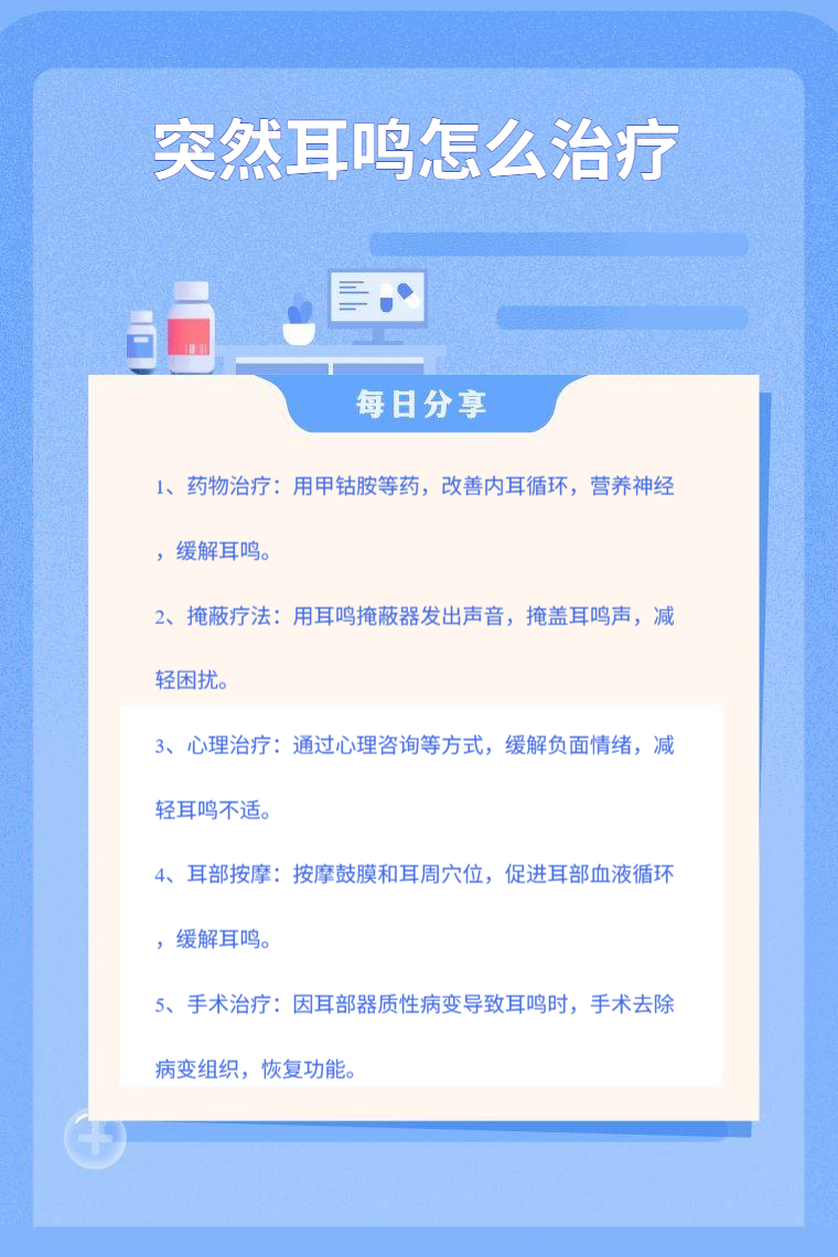 突然耳鸣可通过药物治疗、掩蔽疗法、心理治疗、耳部按摩、手术治疗等方法来应对。