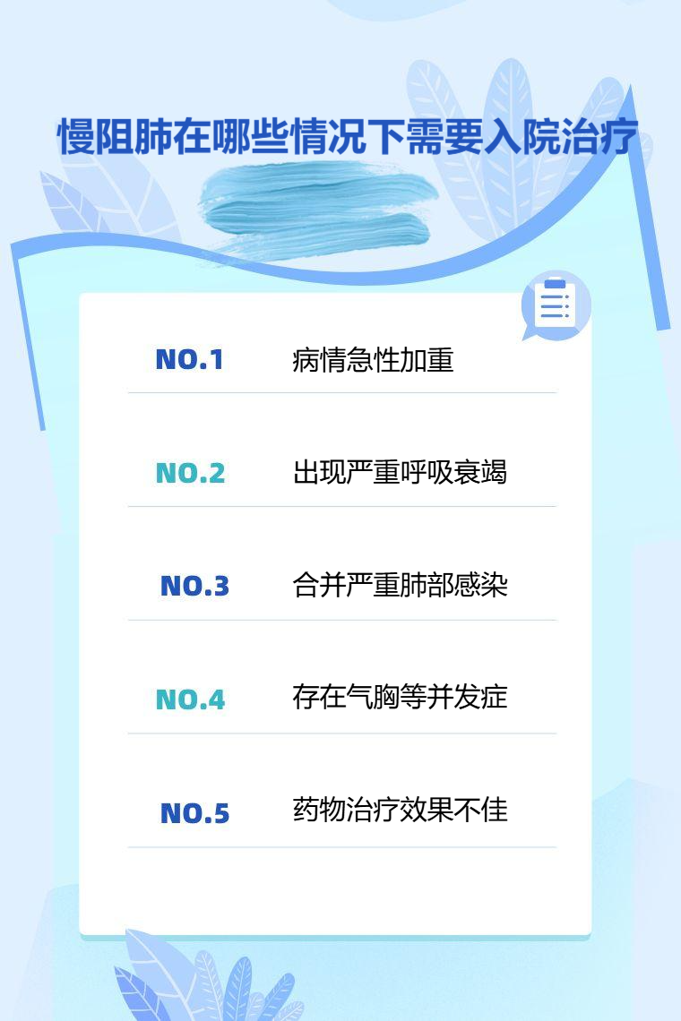 慢阻肺在病情急性加重、出现严重呼吸衰竭、合并严重肺部感染、存在气胸等并发症、药物治疗效果不佳等情况下需要入院治疗。