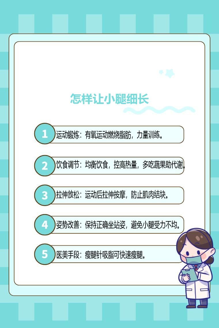 要让小腿细长,需综合多种方法并长期坚持。运动和饮食调节是基础,日常注意保持良好姿势和适当拉伸放松。若选择医美手段,务必选择正规机构和专业医生操作。同时,关注自身身体状况,如有不适及时咨询专业人士。