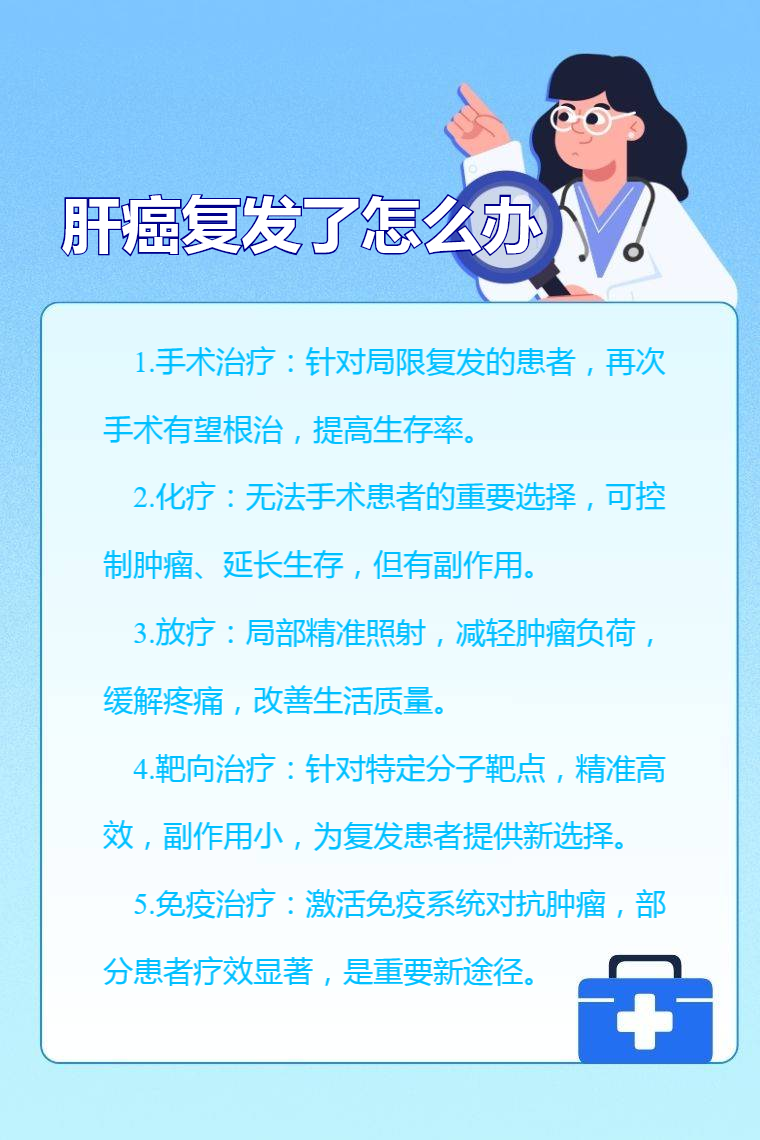 1. 手术治疗:若复发肿瘤局限,未发生远处转移,患者身体状况能耐受手术,可考虑再次手术切除肿瘤。部分患者通过手术有望实现根治,提高生存率。比如复发肿瘤较小且位于肝脏边缘,手术切除相对容易。