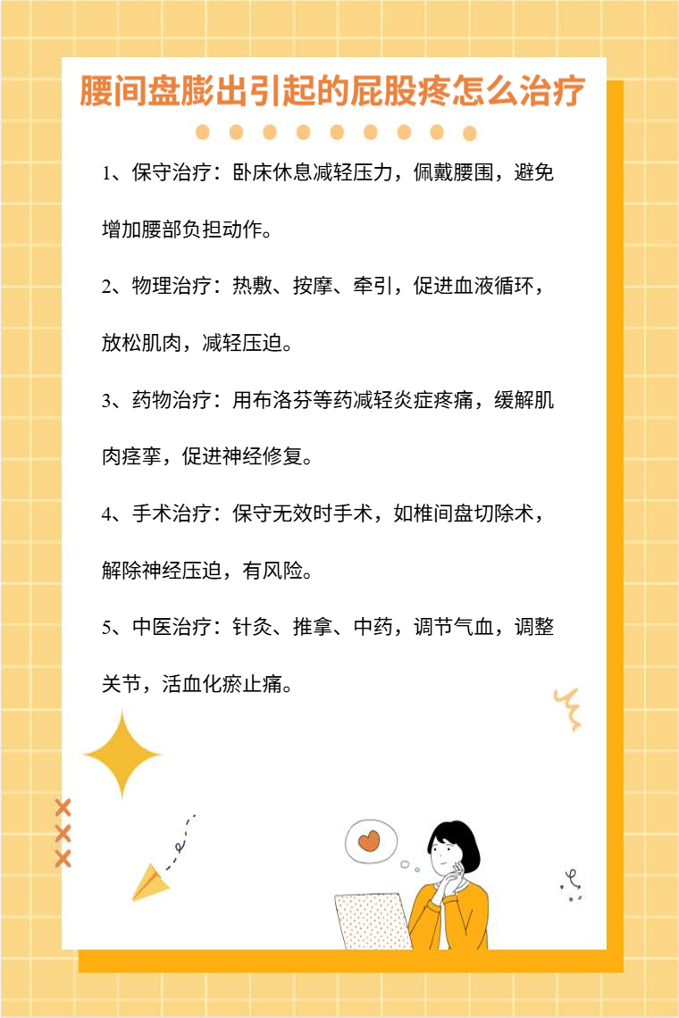 腰间盘膨出引起屁股疼的治疗方法有保守治疗、物理治疗、药物治疗、手术治疗、中医治疗等。