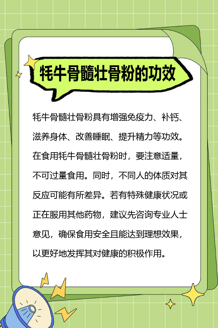 牦牛骨髓壮骨粉具有增强免疫力、补钙、滋养身体、改善睡眠、提升精力等功效。