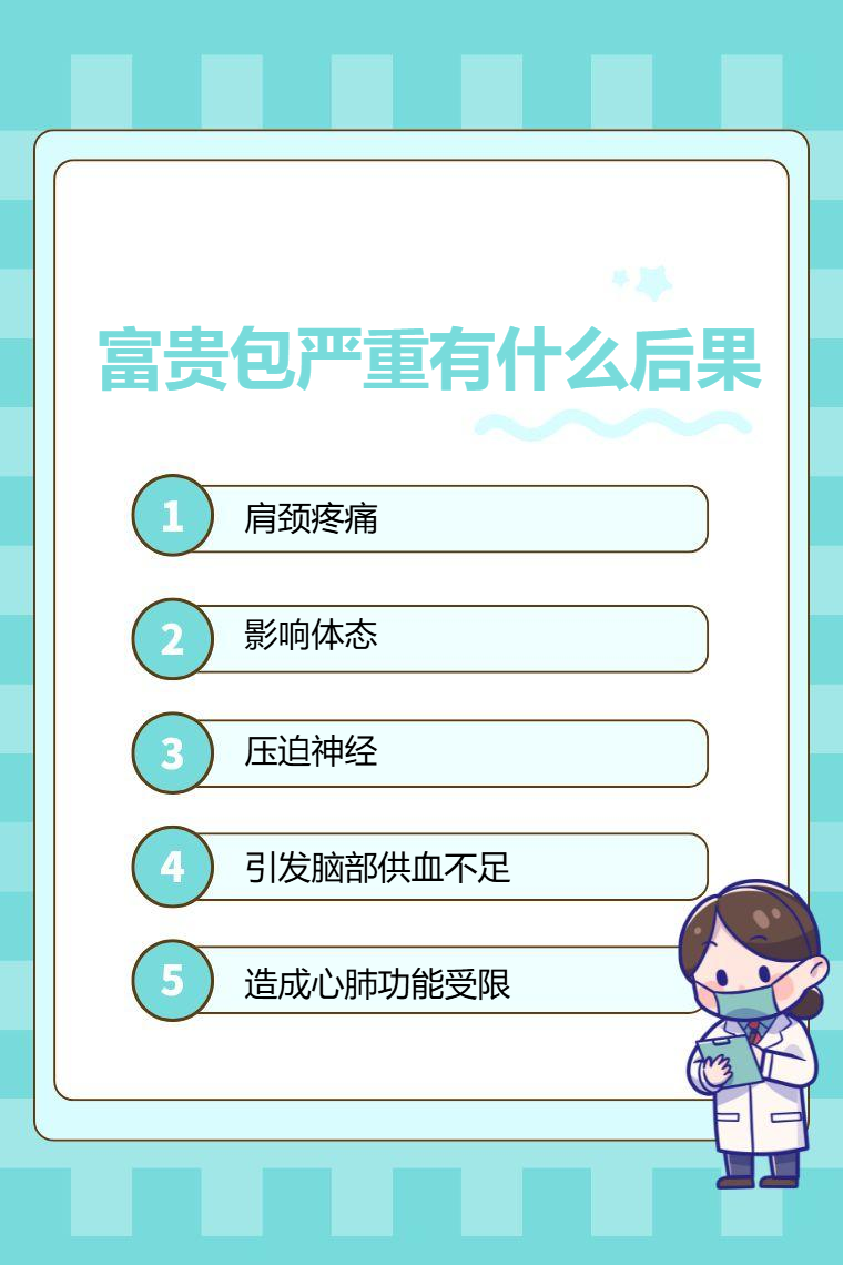富贵包严重可能导致肩颈疼痛、影响体态、压迫神经、引发脑部供血不足、造成心肺功能受限等。