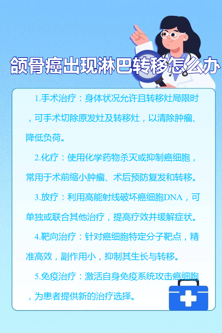 颌骨癌出现淋巴转移可通过手术治疗、化疗、放疗、靶向治疗、免疫治疗等。