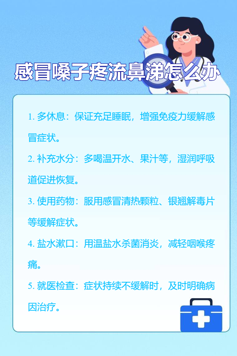 感冒嗓子疼流鼻涕可通过多休息、补充水分、使用药物、盐水漱口、就医检查等方法来缓解症状。