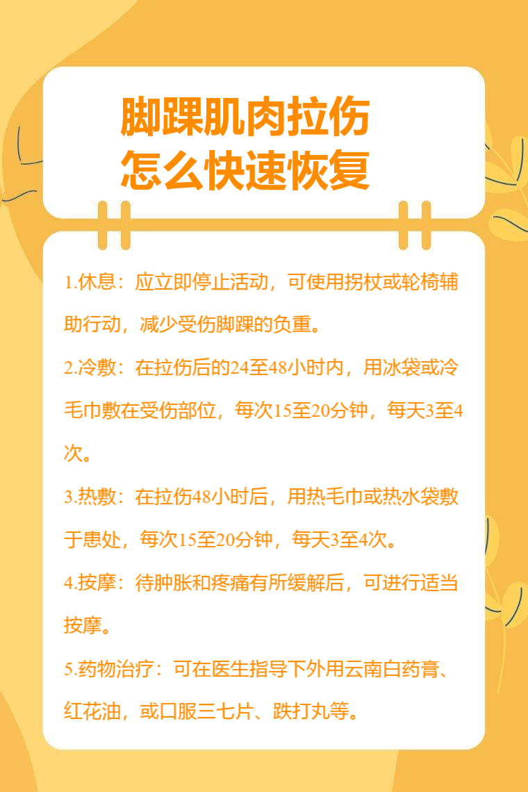 脚踝肌肉拉伤可通过休息、冷敷、热敷、按摩、药物治疗等快速恢复。