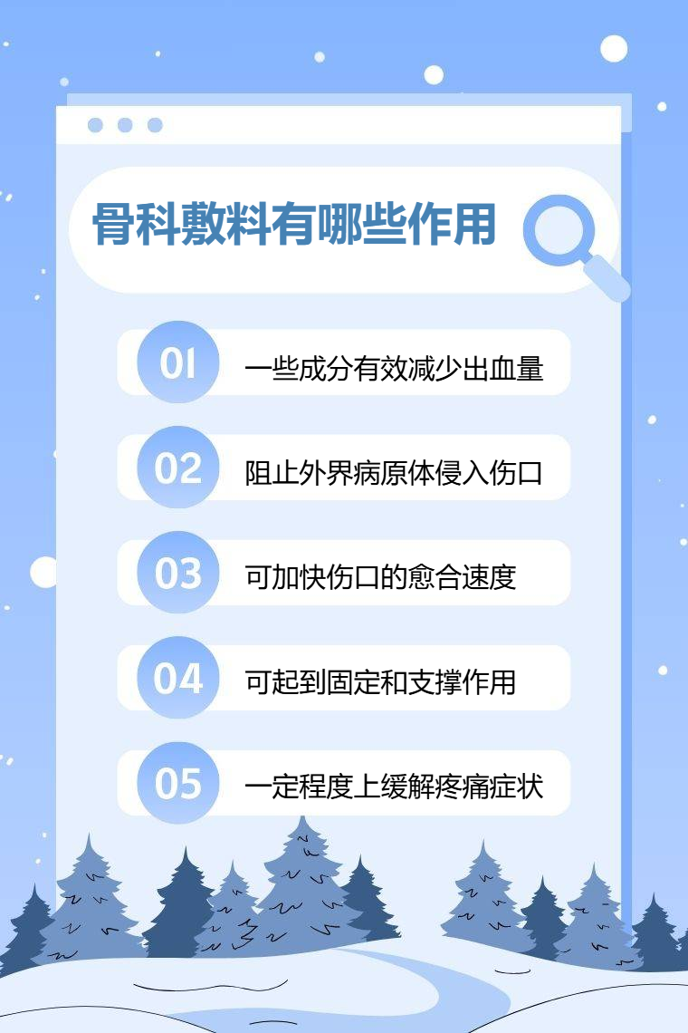 骨科敷料具有止血、抗感染、促进伤口愈合、固定支撑、缓解疼痛等作用。