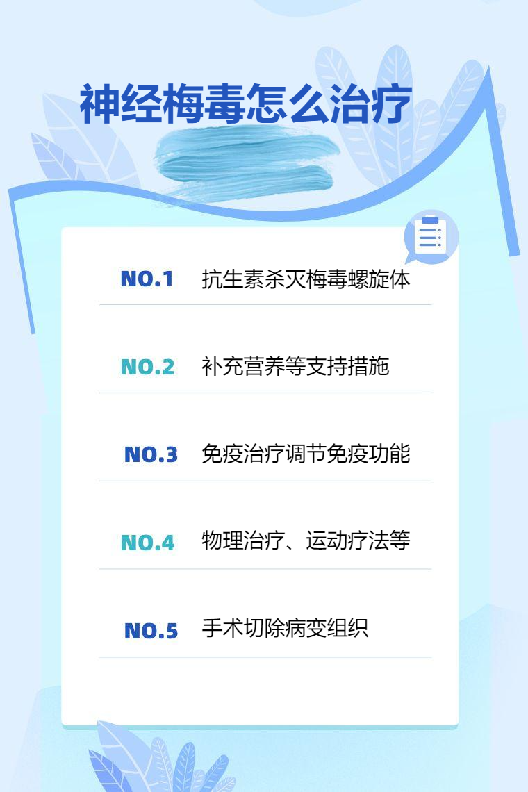 神经梅毒的治疗方法主要有抗生素治疗、支持治疗、免疫调节治疗、康复治疗、手术治疗等。