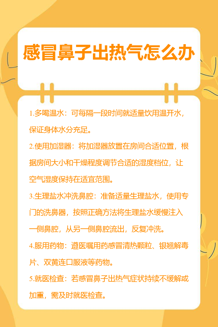 5.就医检查:若感冒鼻子出热气症状持续不缓解或加重,需及时就医检查。医生会通过详细检查明确病因,判断是否合并细菌感染等,然后针对性治疗。可能会进行血常规等检查,根据检查结果给予合适的治疗方案,如使用抗生素等,以有效控制病情。