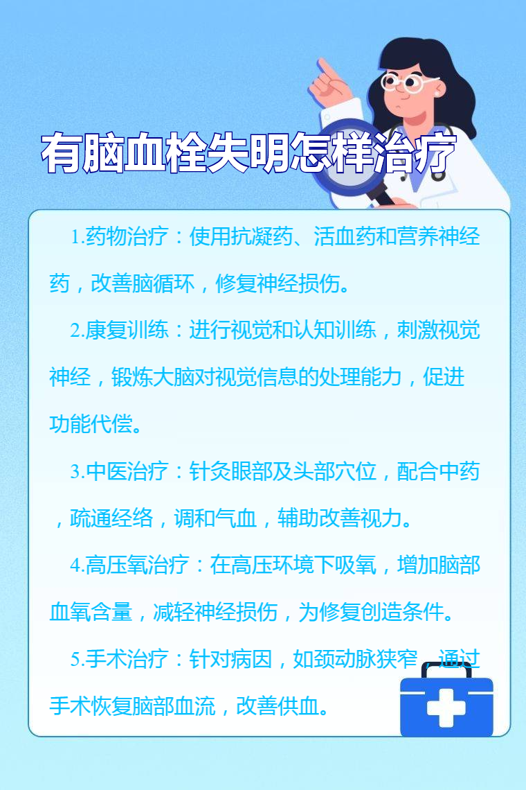 脑血栓失明的治疗方法有药物治疗、康复训练、中医治疗、高压氧治疗、手术治疗等。