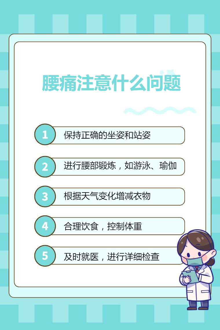 5. 就医:若腰痛持续不缓解或伴有下肢麻木、无力、大小便失禁等症状,应及时就医,进行详细检查,明确病因,接受规范治疗,避免延误病情。