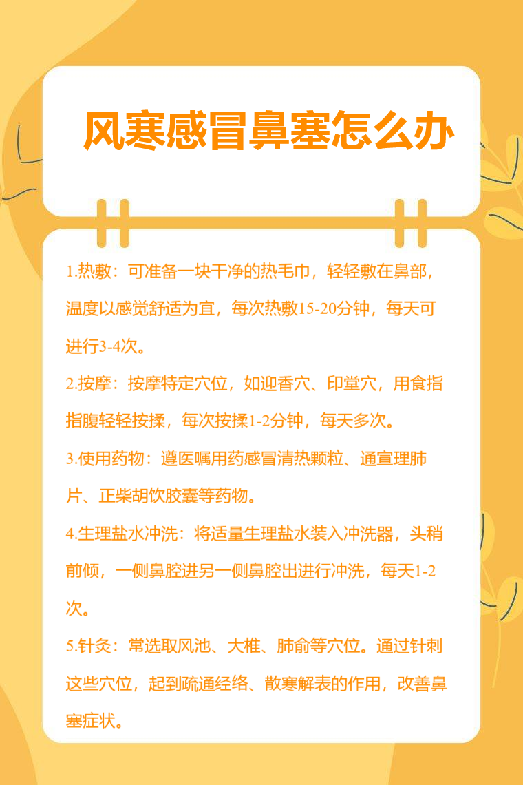 2.按摩:按摩特定穴位有助于调节身体气血运行,增强抵抗力,对风寒感冒鼻塞有改善作用。比如按摩迎香穴,位于鼻翼外缘中点旁,鼻唇沟中。用食指指腹轻轻按揉,每次按揉1-2分钟,每天多次。还可按摩印堂穴,在两眉之间,同样用指腹按揉,能促进鼻部气血流通,减轻鼻塞。