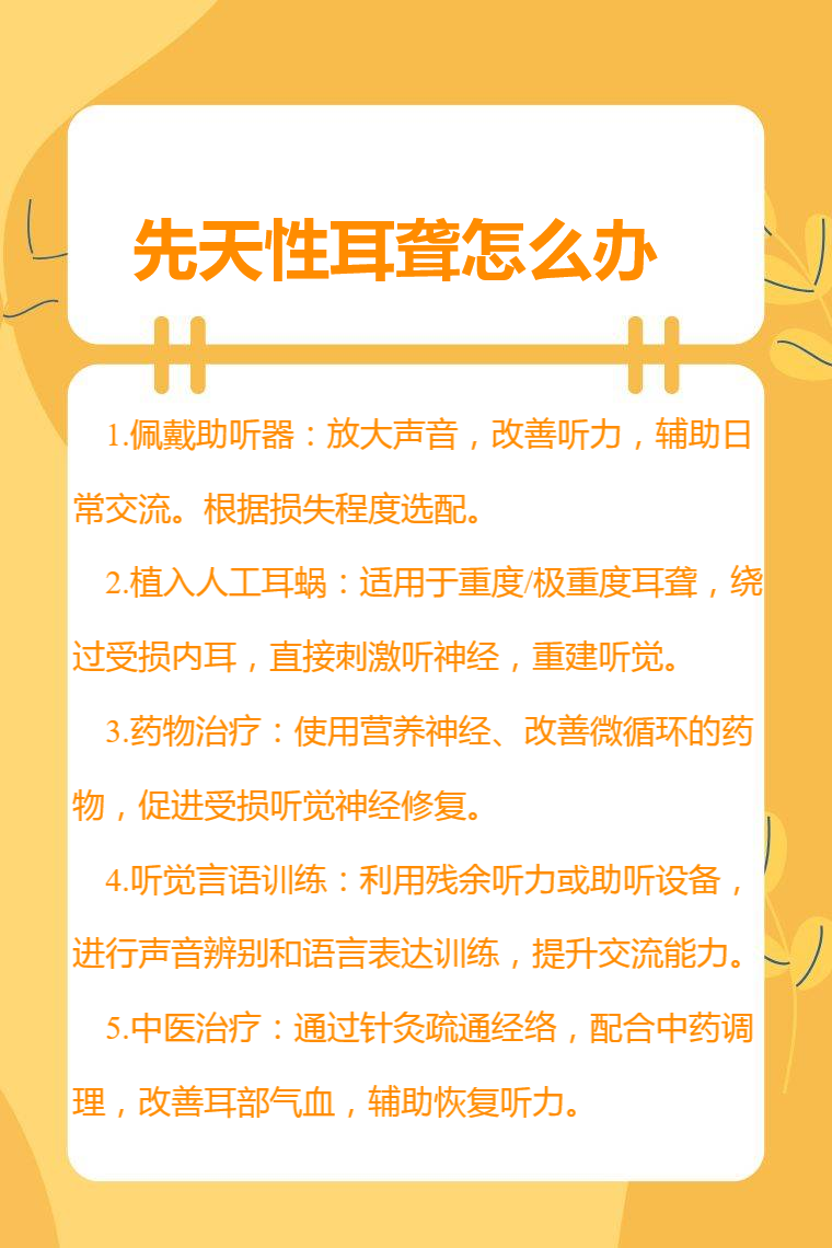 先天性耳聋可通过佩戴助听器、植入人工耳蜗、药物治疗、听觉言语训练、中医治疗等方法改善。