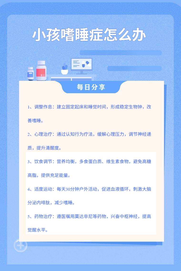 小孩嗜睡症可通过调整作息、心理治疗、饮食调节、适度运动、药物治疗等方法来应对。
